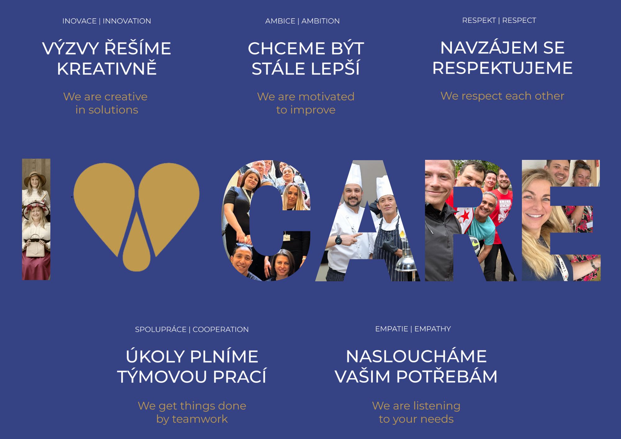 Jsme rodinná firma a za služby poskytované v našich hotelech ručíme svým jménem. Naším cílem je zaměstnávat odhodlané a kvalifikované pracovníky, jejichž snahou je splnit individuální potřeby hostů a zajistit obchodní úspěch našich hotelů i v příštích letech. Snažíme se proto vytvořit našim zaměstnancům pracovní prostředí založené na čestnosti, spolehlivosti a respektu. Jako společnost uznáváme a žijeme podle systému hodnot I CARE. Tyto hodnoty uplatňujeme jak uvnitř naší firmy, tak navenek. Věříme totiž, že nám zaručí vaši pozitivní zkušenost s JAN HOTELS i dlouhodobý úspěch naší společnosti.